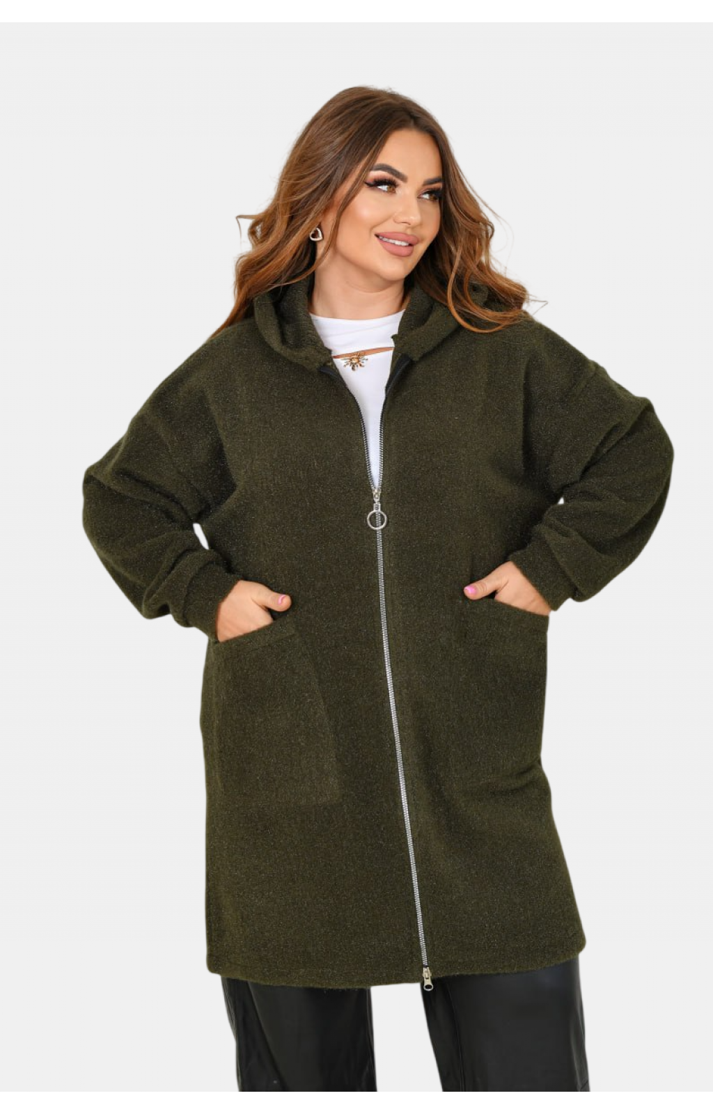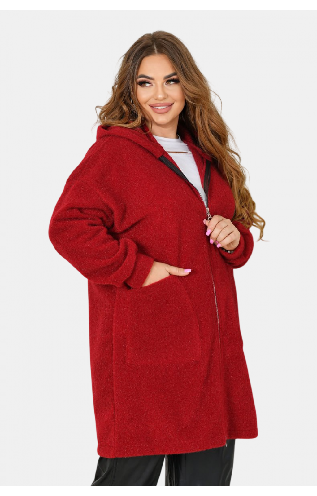 Кардиган з папюшоном із м'якого ворсистого трикотажу (Альпака). Кардиган має прямий вільний силует та капюшон. Лінія плеча спущена, рукав на манжеті. Застібається на блискавку. Попереду є дві накладні кишені.