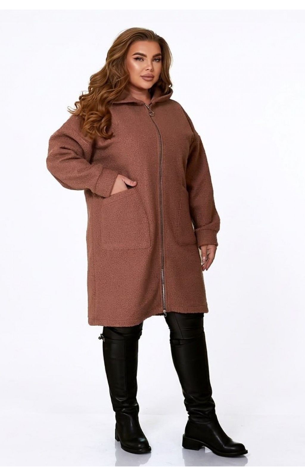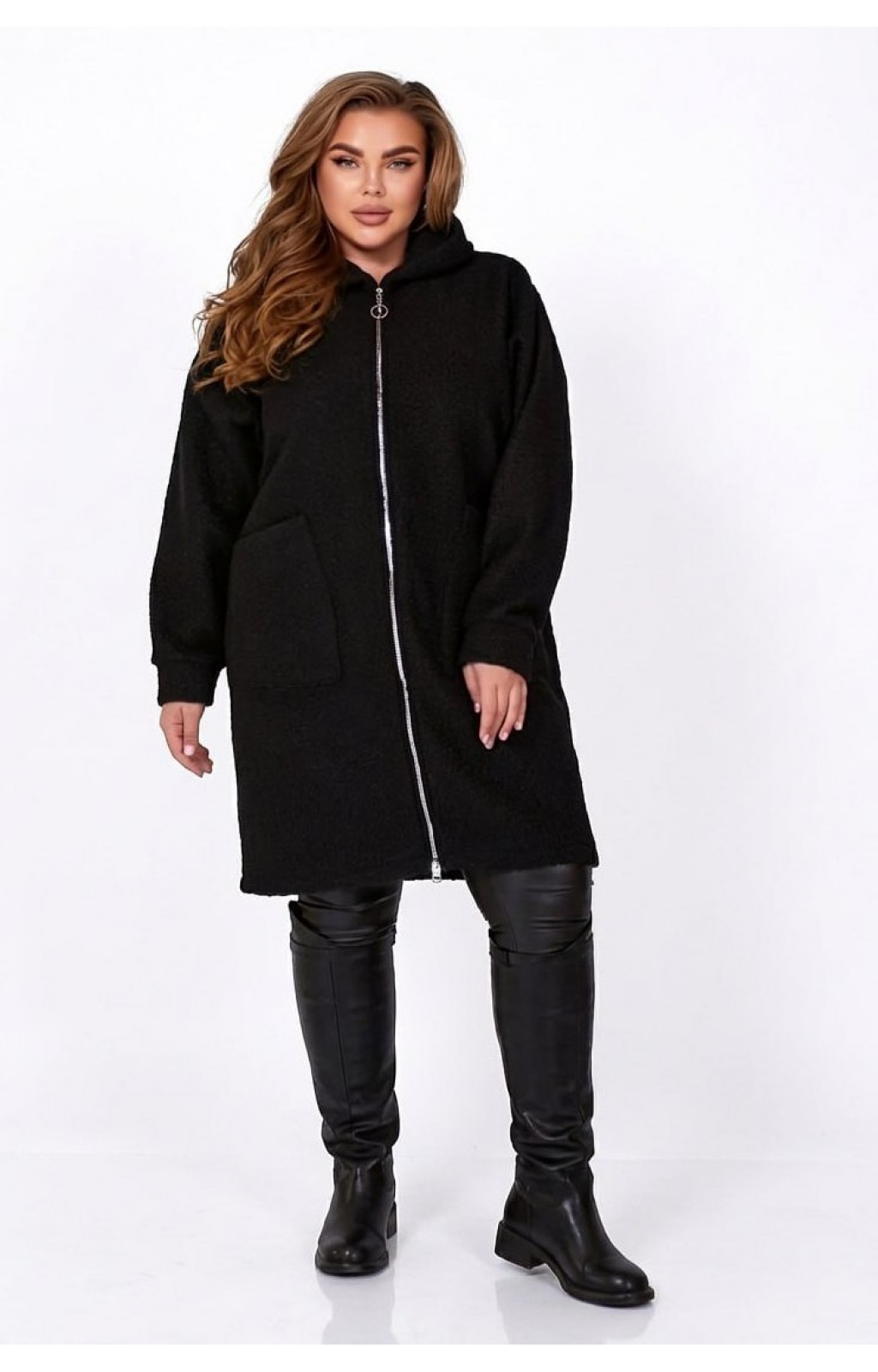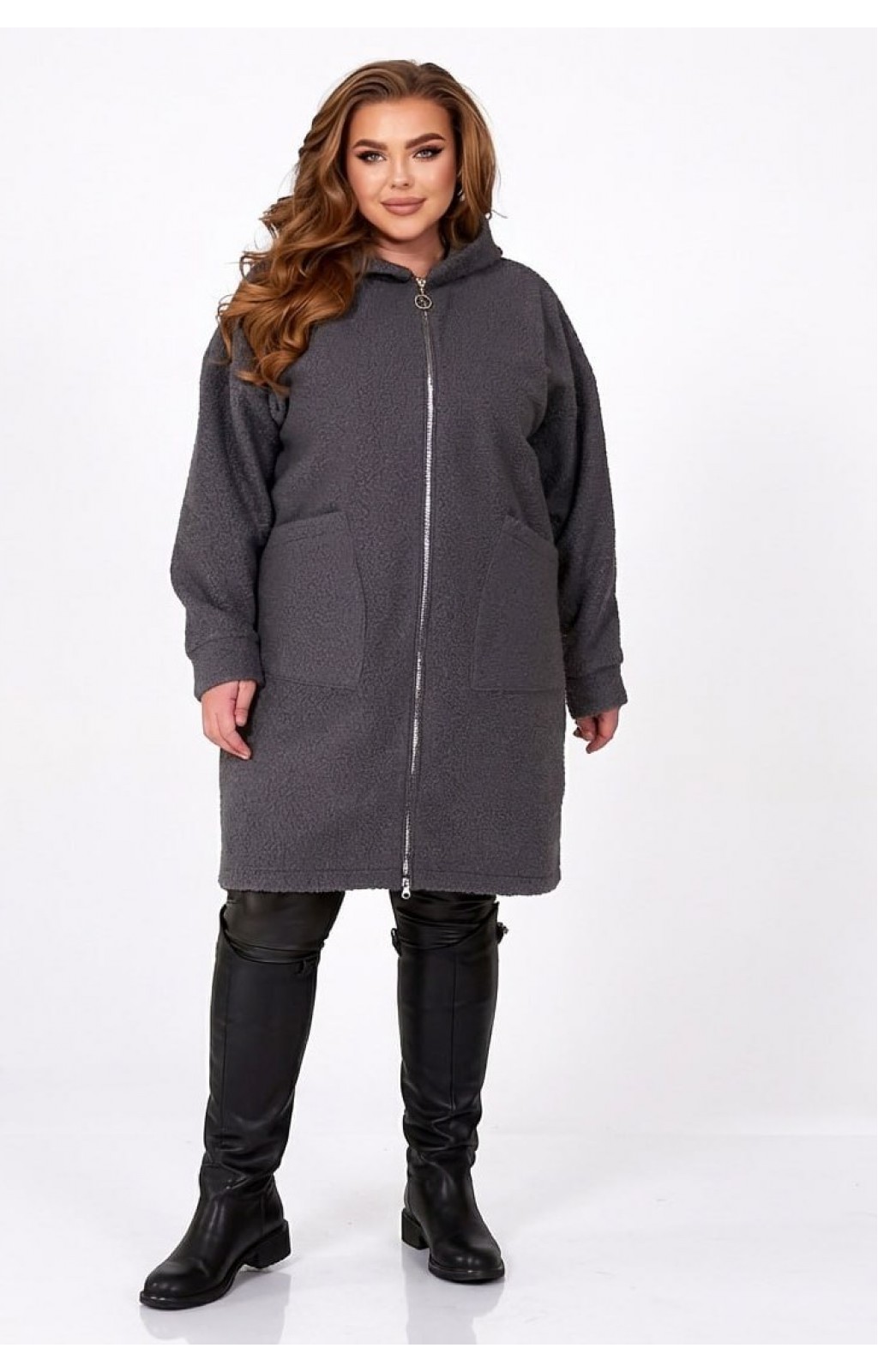 Жіноче Пальто-кардіган вовна ILATA великого розміру виготовлене з тканини «баранець» (середня розтяжність). Пальто-кардіган ILATA має прямий вільний силует та капюшон. Лінія плеча спущена, рукав на манжеті. Застібається на блискавку. Попереду є дві накладні кишені.